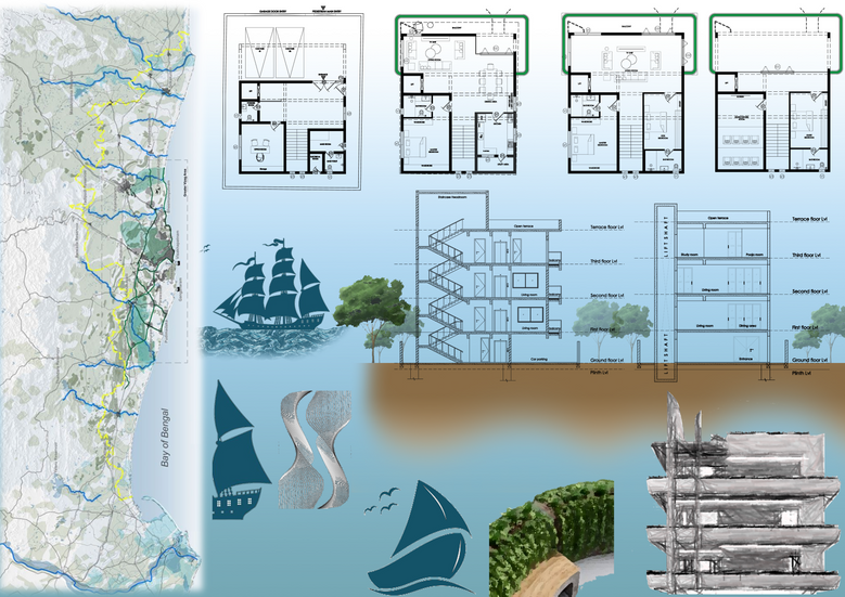 Metal fretwork, meticulously crafted, adds layers of texture and rhythm to the design—filtering light, casting shadows, and reinforcing the nautical narrative. The interplay of solid and void, openness and enclosure, creates a dynamic visual experience that shifts with the changing light of the day. Inside, the villa continues the story with fluid spatial planning, natural materials, and panoramic openings that embrace the coastal breeze.
