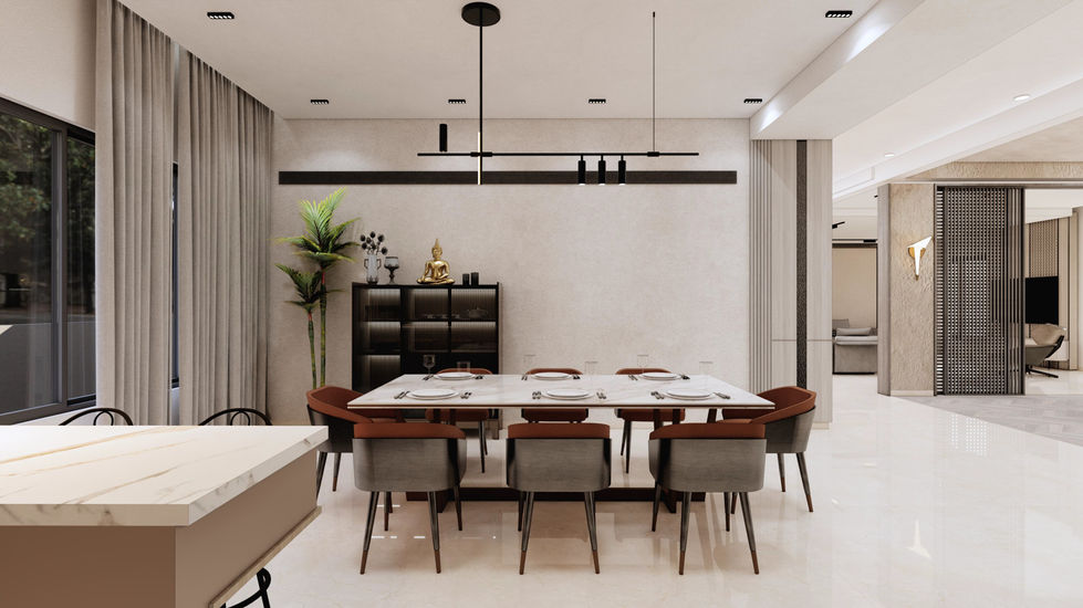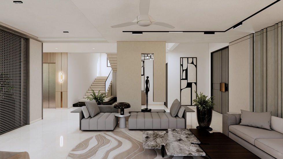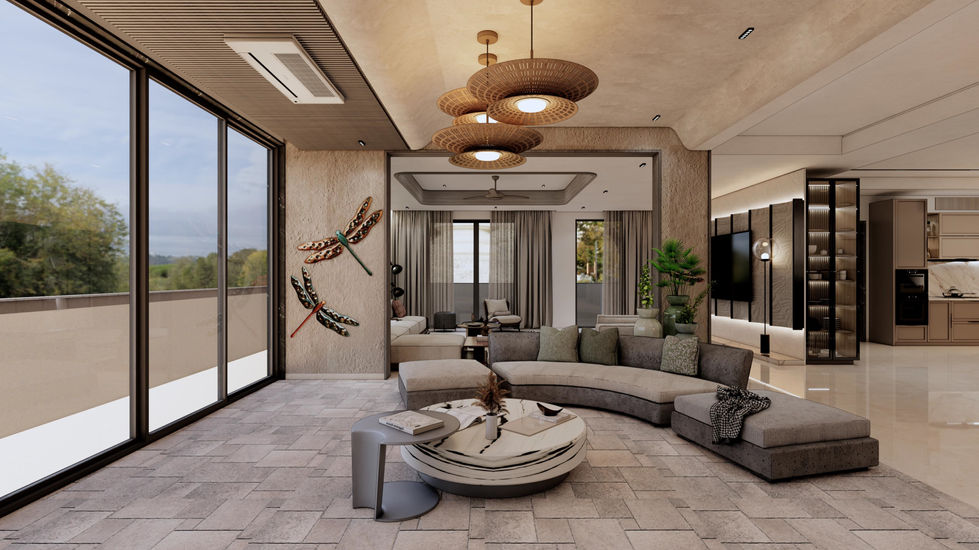 Lush plants are an integral part of the design, weaving through courtyards, terraces, and living spaces to create a sense of tranquility. Neutral tones, warm wood, and stone textures add depth while maintaining a minimalist aesthetic. The layout is intuitive and airy, designed for comfort and effortless living.
